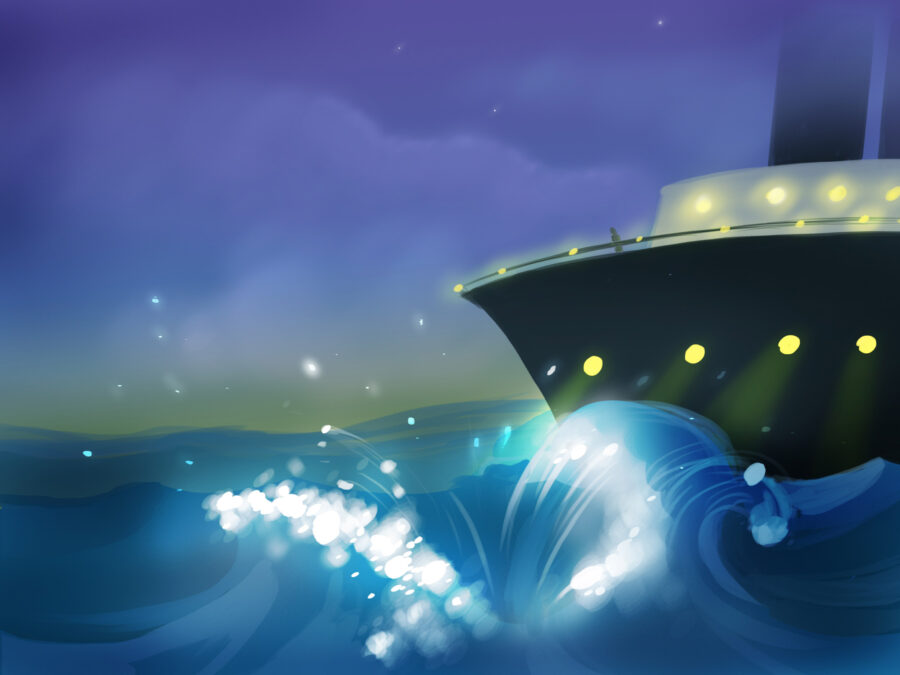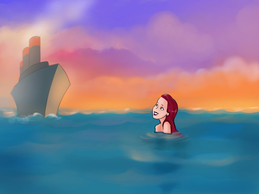 Al fin la más joven cumplió los quince años y subió a la superficie. El sol acababa de ocultarse cuando la sirenita asomó la cabeza fuera de las olas. En el mar reinaba una calma absoluta y el aire era fresco y suave. Las nubes relucían como rosas de oro, el cielo – color rosa, y en él la estrella de la tarde, clara y bella. Había un gran barco anclado a poca distancia.