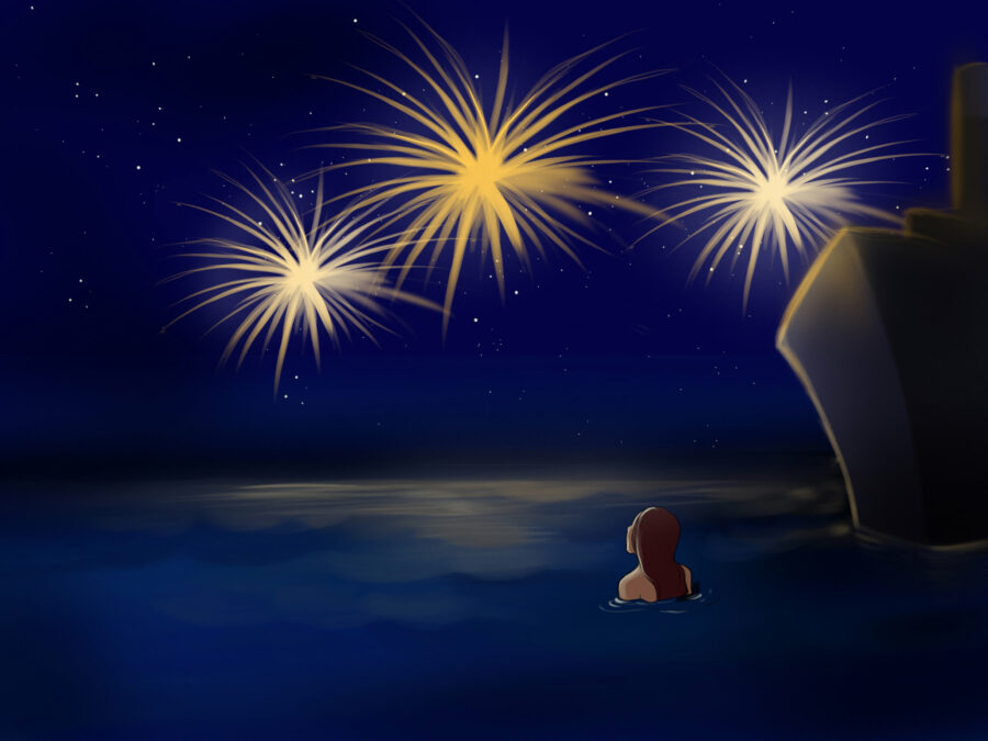 Cuando el príncipe apareció en la cubierta los marineros dispararon más de cien fuegos de artificio los que brillaron en el cielo, iluminando todo como la luz del día. Asustada la princesita se apresuró a sumergirse unos momentos. Al asomarse otra vez, le pareció como si todas las estrellas del cielo cayesen sobre ella. Nunca antes había visto fuegos artificiales.