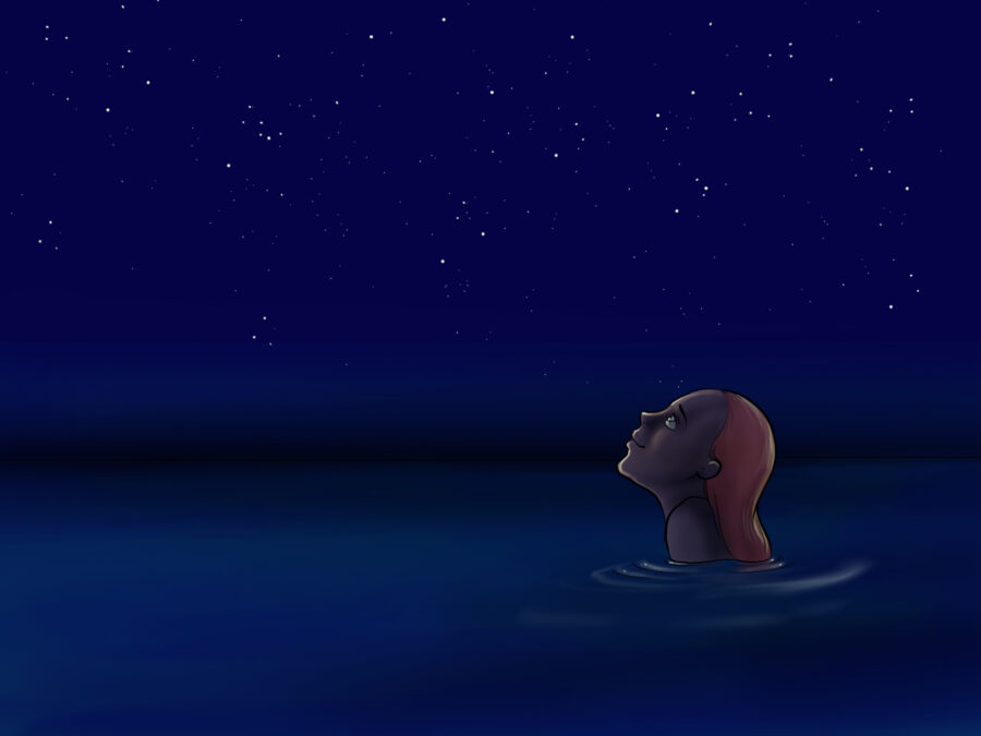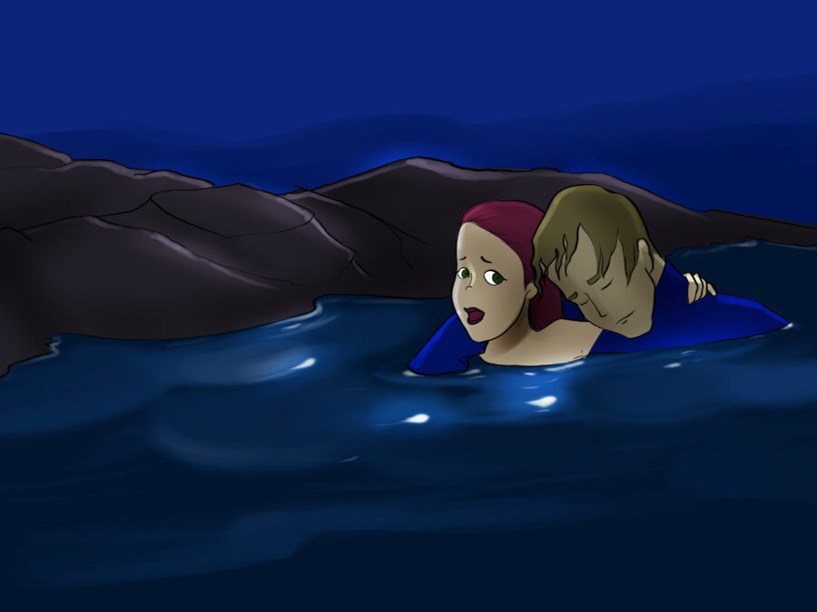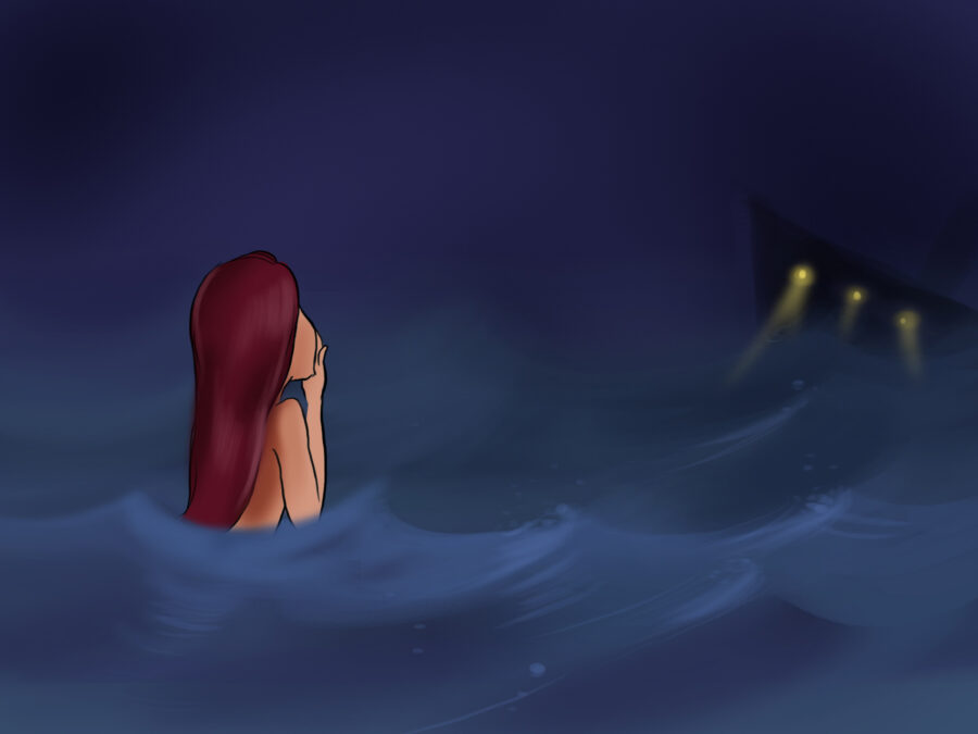 La oscuridad era completa. No podía distinguir nada. En ese momento, un relámpago dio una fuerte luz, permitiéndole inspeccionar la cubierta. Como no pudo ver al príncipe por ningún lado, se echó a nadar hasta buscarle en las profundidades del mar, olvidando que esos maderos y las planchas podían aplastarle también. Varias veces se sumergió hasta que por fin lo encontró. Este se hallaba con los ojos cerrados sin poder respirar apenas. Si la sirenita no hubiera llegado, el príncipe hubiera muerto. Ella sostuvo su cabeza fuera del agua y dejó que el impulso de las olas les llevara hacia la orilla.