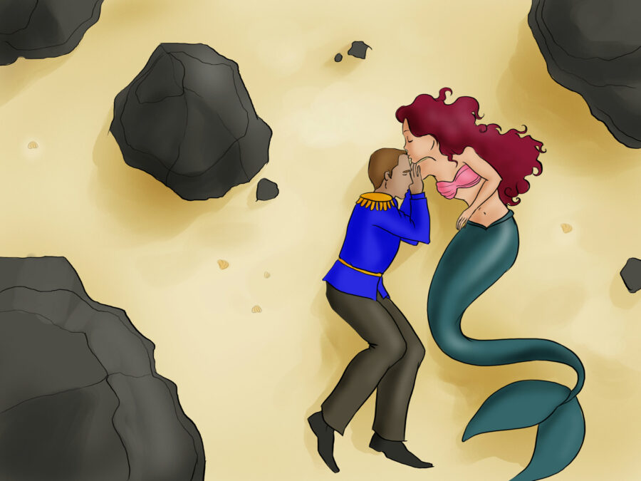 Al amanecer, la tormenta había terminado. Cuando la sirenita abrió los ojos se hallaba junto al príncipe sobre una blanca y fina arena. Ella levantó su cabeza y lo besó en la frente.