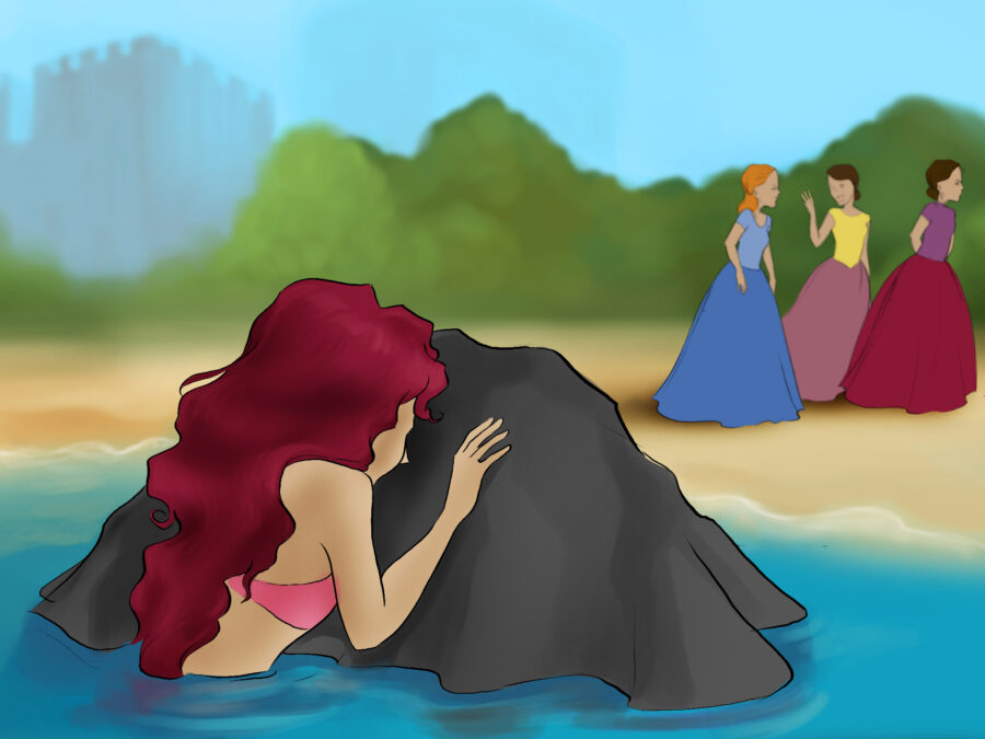 Al poco rato llegó junto a él una de las jóvenes que pareció asustarse en un primer momento. Ella fue en busca de sus compañeras y la sirenita vio como el príncipe volvía a la vida y como les sonreía a las jóvenes que lo rodeaban. Claro que solo a ella no le sonreía con la sonrisa carismática, pues ignoraba que lo había salvado. La sirenita se sintió muy triste y ante esto se sumergió nuevamente al agua y regresó al palacio de su padre.