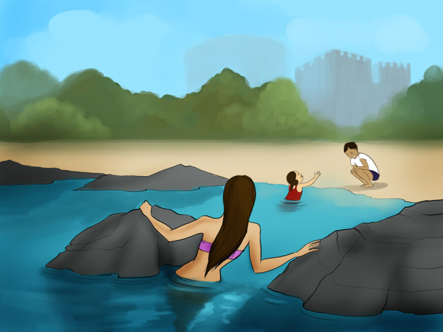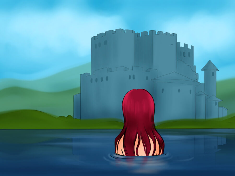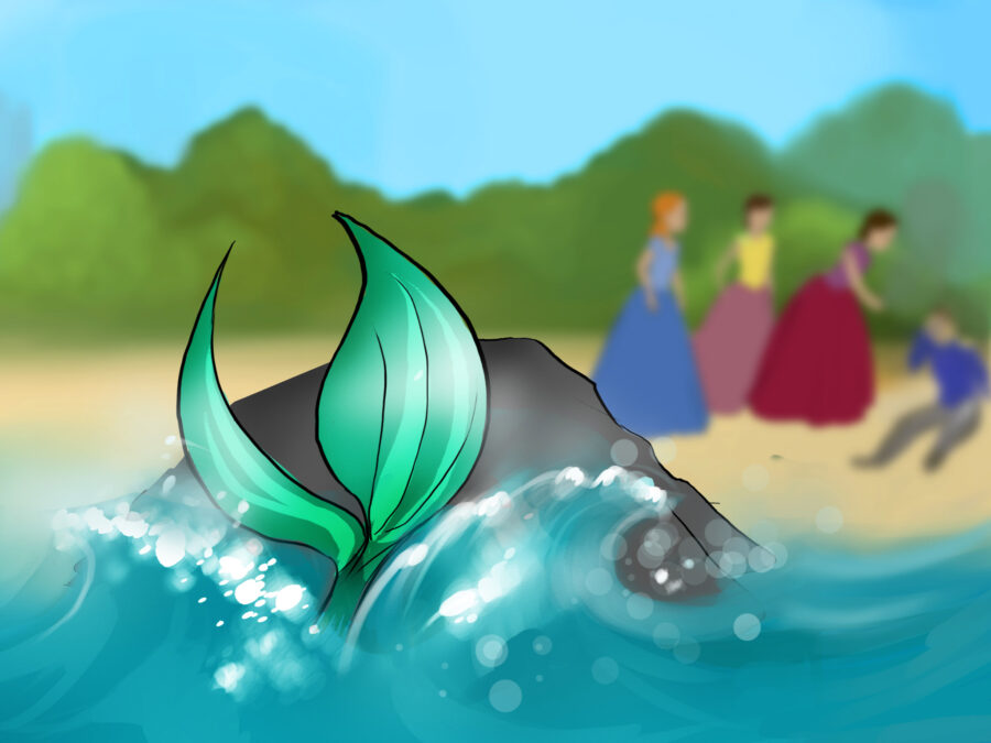 La tercera de las hermanas fue la más audaz cuando le tocó su turno: recorrió un largo rio. En su paseo vio cerros verdes cubiertos de viñas hermosas, bosques con palacios y castillos. En una pequeña bahía se encontró con un grupo de niños jugando en el agua. Cuando quiso compartir con ellos, estos huyeron despavoridos. Nunca olvidaría aquellos espléndidos bosques, las viñas y los niños humanos que podían nadar a pesar de no tener cola de pez.