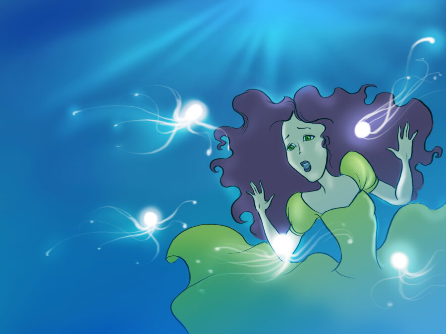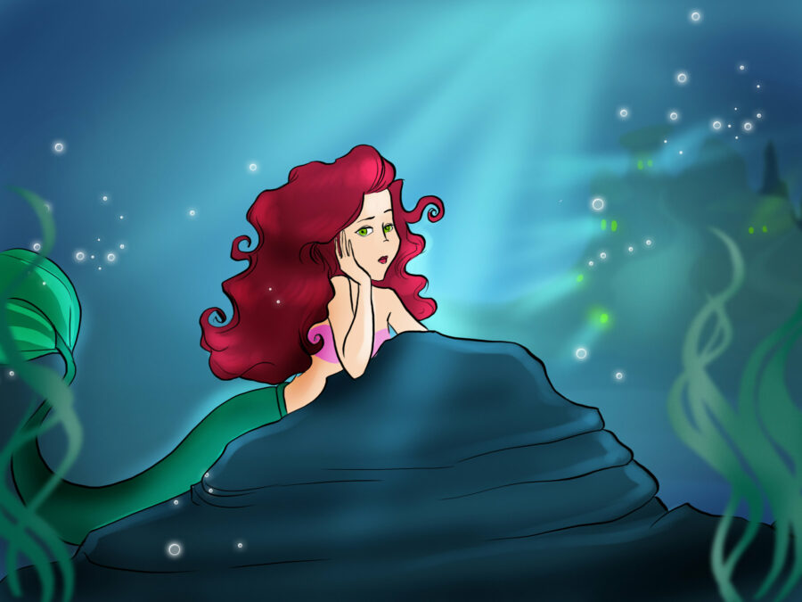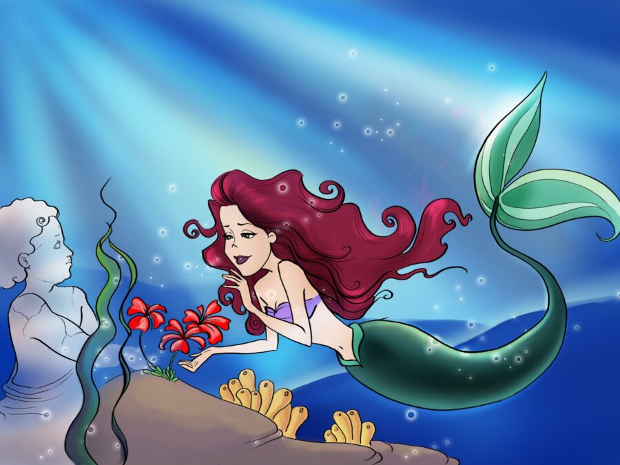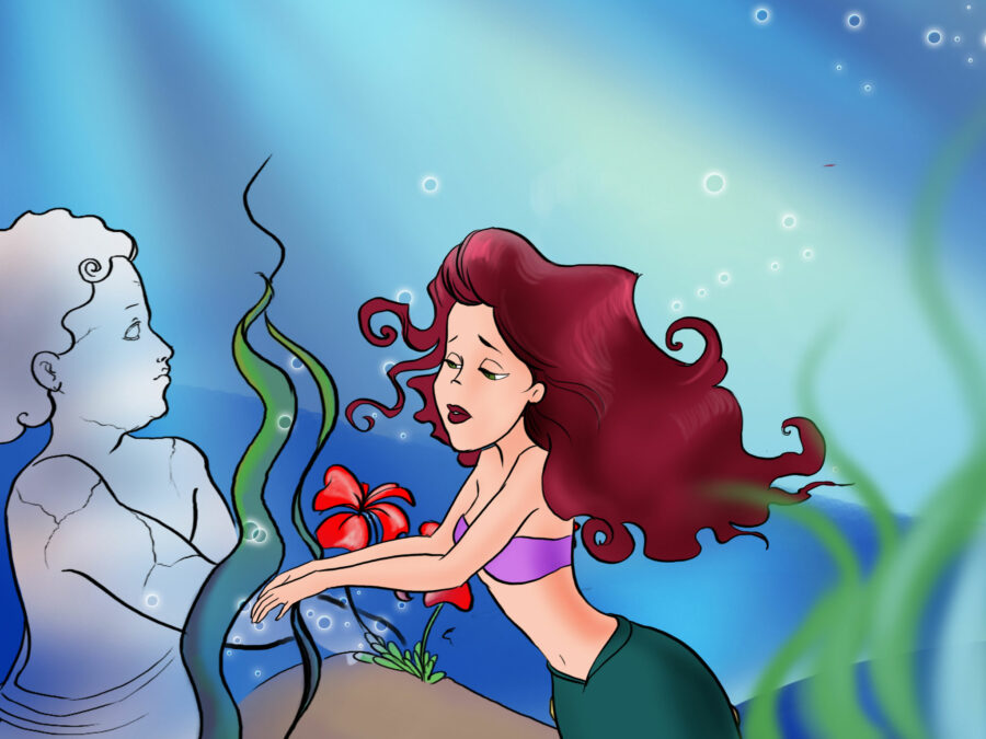 Ella era silenciosa y reflexiva – muy diferente a sus hermanas. Mientras ellas se emocionaban por las cosas maravillosas que encontraban en los naufragios, a ella no le importaba nada más que sus bonitas flores de color rojo y una hermosa estatua de mármol blanco de un joven apuesto que alguna vez cayó en el fondo del mar.