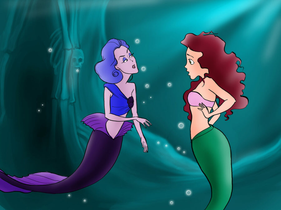 Nadó por un largo rato hasta que por fin llegó a una casa construida con huesos humanos. Antes de que ella pudiera tocar la puerta, escuchó la voz malvada de una bruja: “Ya sé lo que quieres”. En ese momento la bruja apareció en frente de ella. “Quieres librarte de la cola de pez y en lugar de ella tener dos piernas. Es una estupidez que te traerá solo pena y desgracia, pero estoy dispuesta a satisfacer tu deseo de obtener un alma inmortal”.