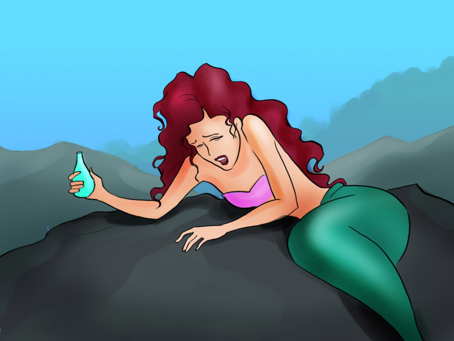 El sol no había salido aún, cuando llegó a la costa y se tomó el brebaje mágico. Al instante sintió como si una espada de doble filo le atravesara todo el cuerpo y cayó desmayada sobre las rocas.