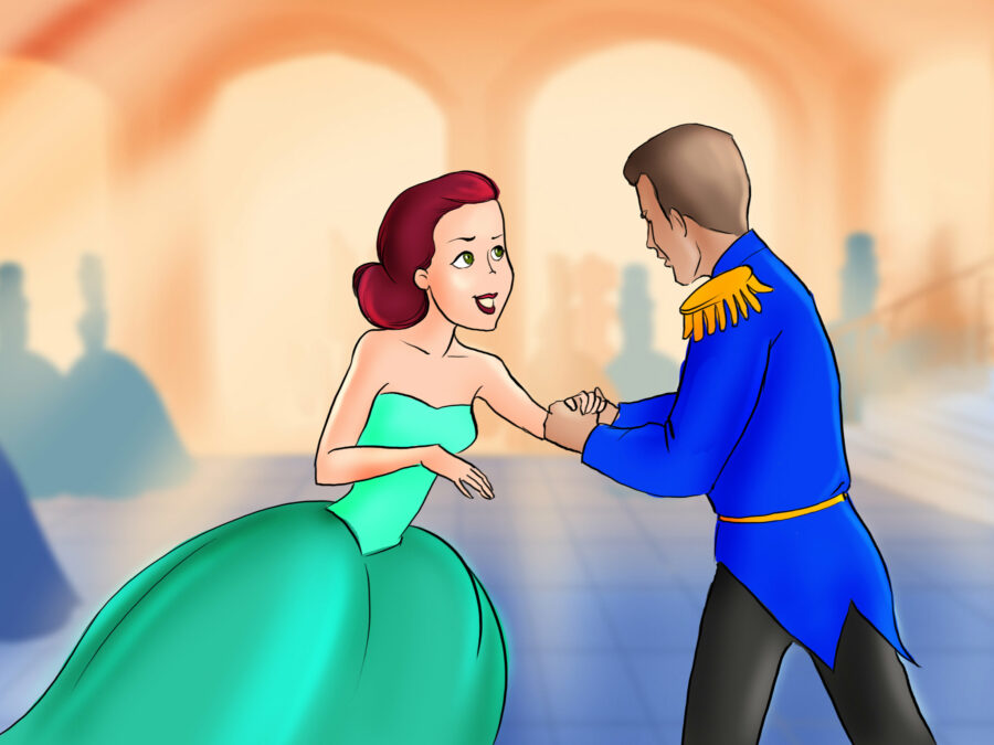 La sirenita estaba tan feliz de hallarse finalmente en el palacio que no podía dejar de sonreír. El príncipe le puso el nombre de “mi pequeña niña amparada”. En el baile que se celebró esa misma noche no podía dejar de mirarla mientras bailaba. La princesita bailaba como nadie nunca antes la había visto bailar.