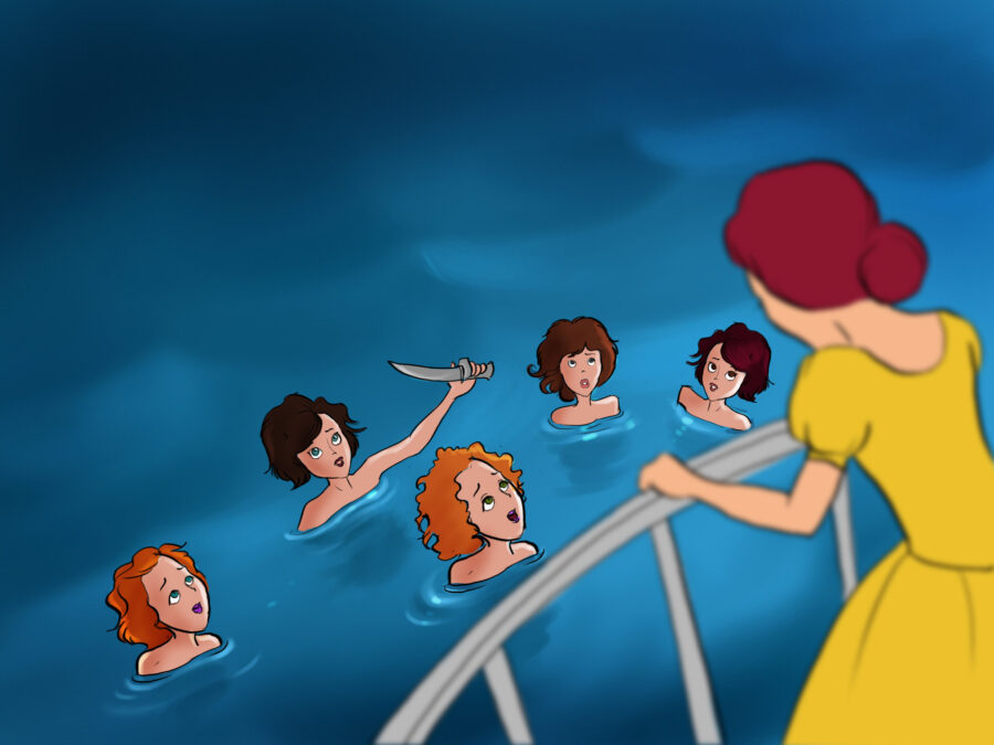 La boda fue esa misma tarde en el barco. La sirenita estaba mirando hacia el oriente, hacia el palacio de su padre. Entonces vio a sus hermanas que emergían de las aguas, pálidas como ella, pero les habían cortado sus largas y hermosas cabelleras. “Hemos dado nuestras cabelleras a la bruja a cambio de que tu vivas. Nos dio este cuchillo. Antes de que salga el sol, debes clavarlo en el corazón del príncipe y cuando su sangre caiga sobre tus pies, volverá a crecerte la cola de pez y ¡serás de nuevo una sirena! Sino, te convertirás en espuma flotando en el agua”. Y con un profundo suspiro se hundieron en las olas.