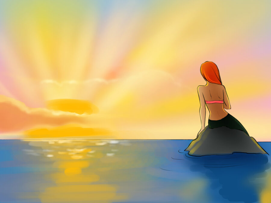 Al año siguiente, la segunda obtuvo permiso para subir a la superficie y nadar por donde quisiese. Emergió en el momento preciso de la puesta de sol y según su relato, aquel espectáculo le pareció el más hermoso de todos. De un extremo al otro, el cielo parecía de oro con nubes rojas y moradas. Y todo, todo, todo se reflejaba en el agua.